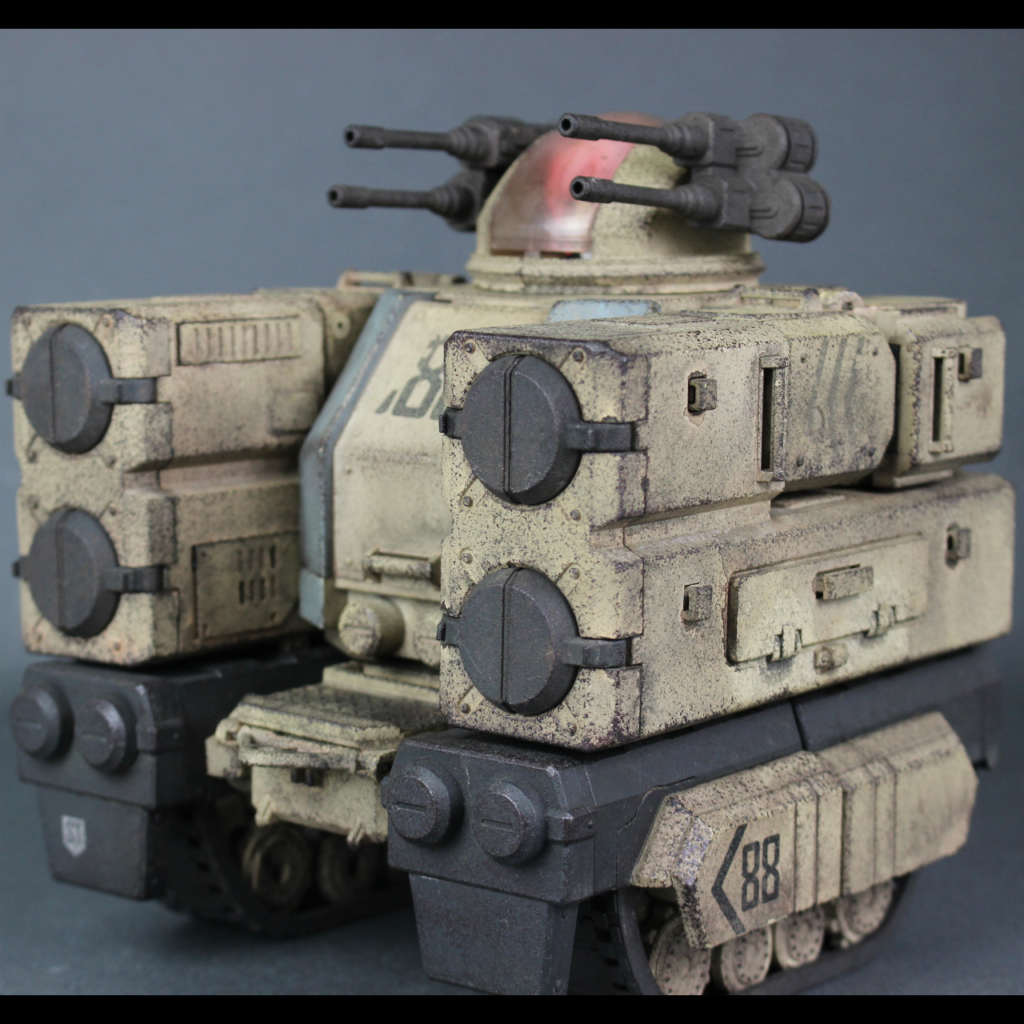 キャタピラが割れて足が出てきて、腰ジョイントが前に行き、腕はロックをはずすだけ、と割と簡単な変形なんですが結構見た目変わりますね。